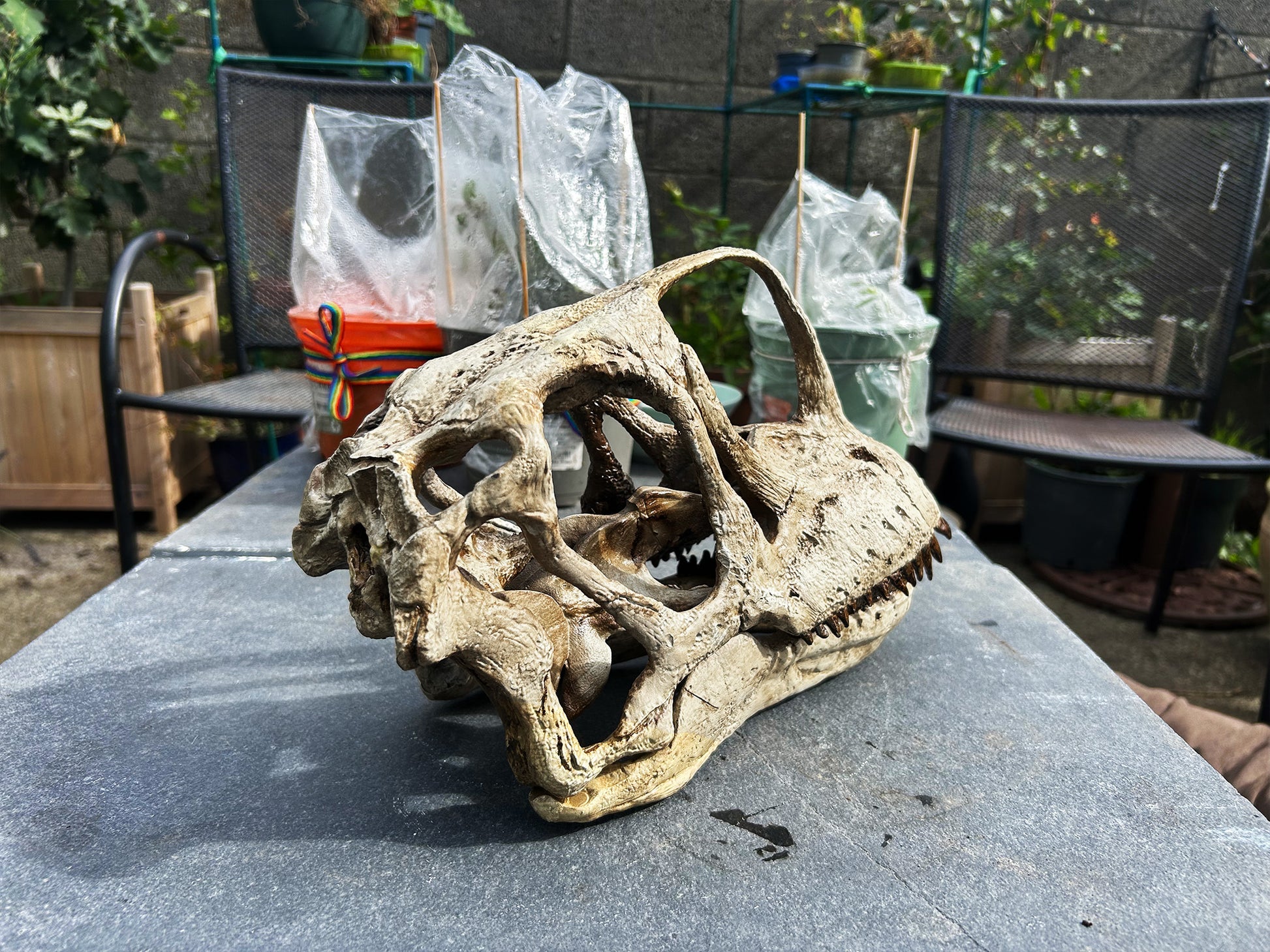 This piece is a hand painted resin Europasaurus holgeri skull. Digitally sculpted in ZBrush and 3D printed, it employs magnets to link the mandible to the skull.